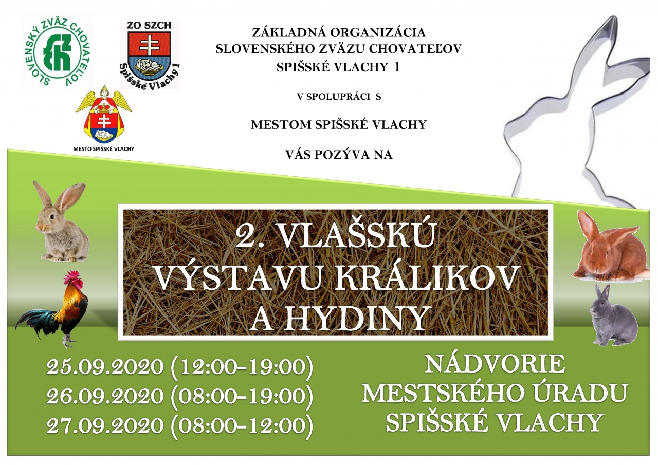 Základná organizácia Slovenského zväzu chovateľov Spišské Vlachy v spolupráci s Mestom Spišské Vlachy Vás pozývajú na 2. ročník Vlašskej výstavy králikov a drobnej hydiny, ktorá sa bude konať na nádvorí mestského úradu Spišské Vlachy počas týchto dní: