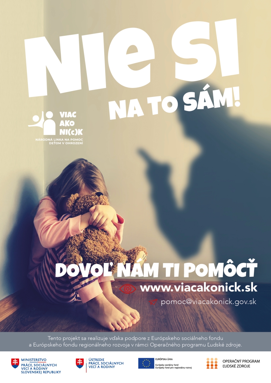 Násilie, s ktorým sa deti stretávajú, môže mať veľa podôb. Od šikany, zosmiešňovania, ponižovania, kyberšikany cez vyhrážanie, bitie, týranie, či sexuálne násilie. Ochrániť ich dokáže len rýchly a účinný zásah. Takúto pomoc deťom ponúka Národná linka na pomoc deťom v ohrození VIAC AKO NI(C)K. Je bezplatná a funguje nepretržite 24 hodín denne/ 7 dní v týždni. Viac v prílohe.