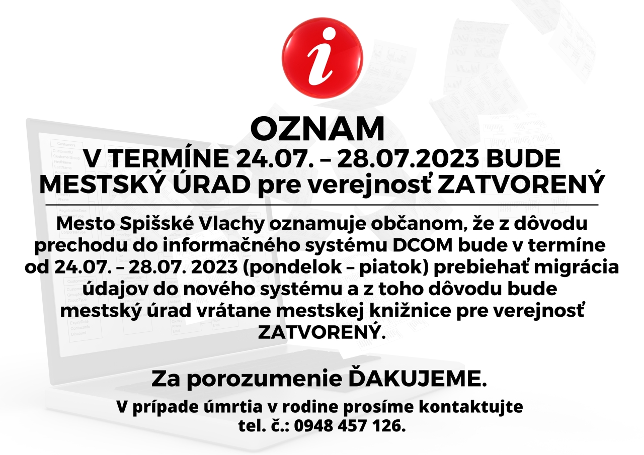 Mesto Spišské Vlachy oznamuje občanom, že z dôvodu prechodu do informačného systému DCOM bude v termíne od 24.07. – 28.07. 2023 (pondelok – piatok) prebiehať migrácia údajov do nového systému a z toho dôvodu bude mestský úrad vrátane mestskej knižnice pre verejnosť ZATVORENÝ.