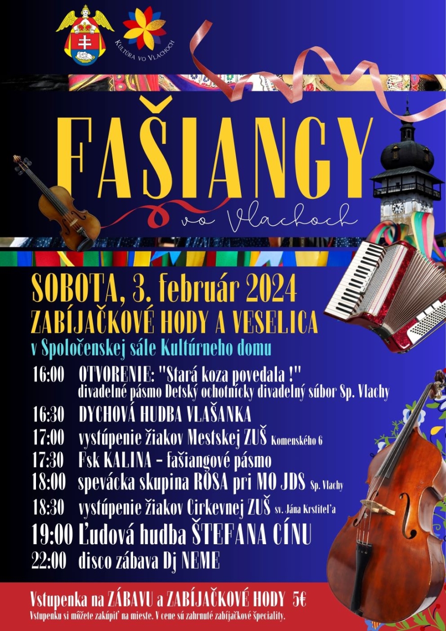 Mesto Spišské Vlachy Vás srdečne pozýva na už tradičnú Fašiangovú veselicu do Kultúrneho domu - „FAŠIANGY VO VLACHOCH“, ktorá sa uskutoční v sobotu, 3. februára 2024, so začiatkom o 16:00 hod. Čaká na Vás nefalšovaná fašiangová zábava, bohatý kultúrny program a zabíjačkové špeciality. Tešíme sa na Vás.