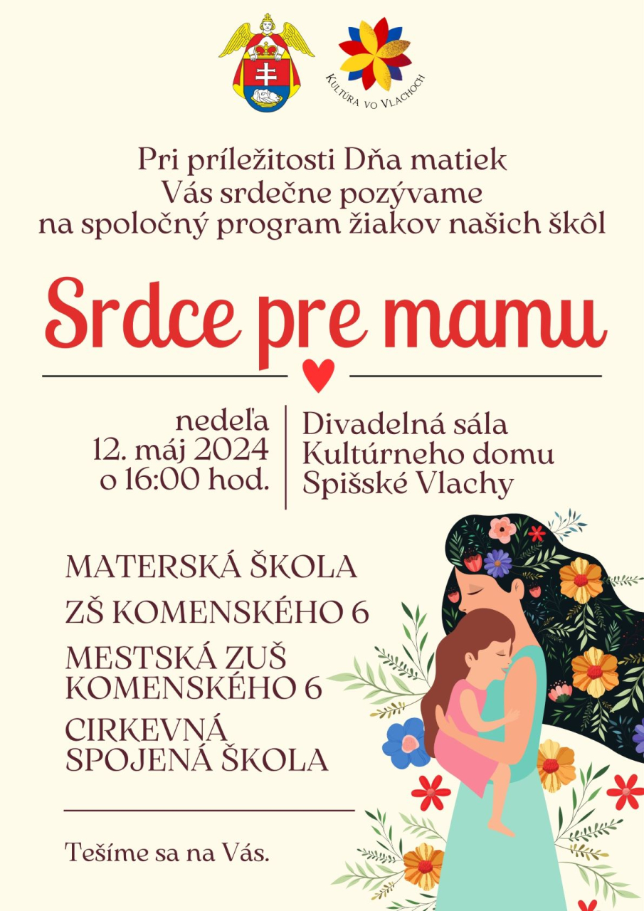 Aj tento rok, spoločne so žiakmi a pedagógmi našich škôl organizujeme pri príležitosti Dňa matiek krásny kultúrny program „SRDCE PRE MAMU“, ktorý sa uskutoční v nedeľu, 12. mája 2024, o 16:00 hod. v Divadelnej sále Kultúrneho domu v Spišských Vlachoch. Všetkých Vás srdečne pozývame.