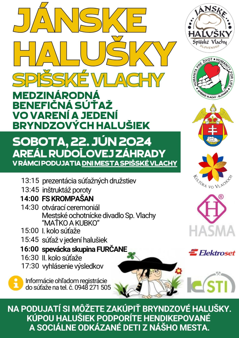 Vážení občania. Aj tento rok v rámci podujatia DNI MESTA SPIŠSKÉ VLACHY pripravujeme spoločne s humanitnou organizáciou Humanita pre život obľúbenú benefičnú súťaž JÁNSKE HALUŠKY. Tento rok bude mať aj medzinárodný charakter, pretože na nej privítame družstvá z Maďarska, Rumunska a zo Srbska. Súťažiť sa bude vo varení a jedení typickej slovenskej špeciality – BRYNDZOVÝCH HALUŠIEK.