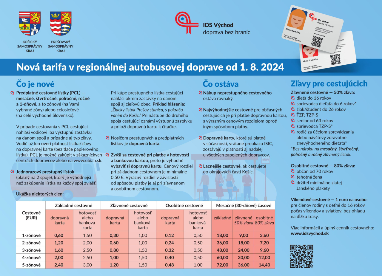 Brázdite aj vy východné Slovensko prímestskými autobusmi? Košický a Prešovský samosprávny kraj pre vás pripravili spoločnú zónovú tarifu plnú noviniek a benefitov. Nová tarifa prinesie jednorazové prestupné lístky aj výhodné predplatné lístky od jednodňového až po ročný. Okrem klasickej dopravnej karty budete môcť využívať i virtuálnu dopravná kartu v mobile s NFC. Viac informácií nájdete na www.idsvychod.sk
