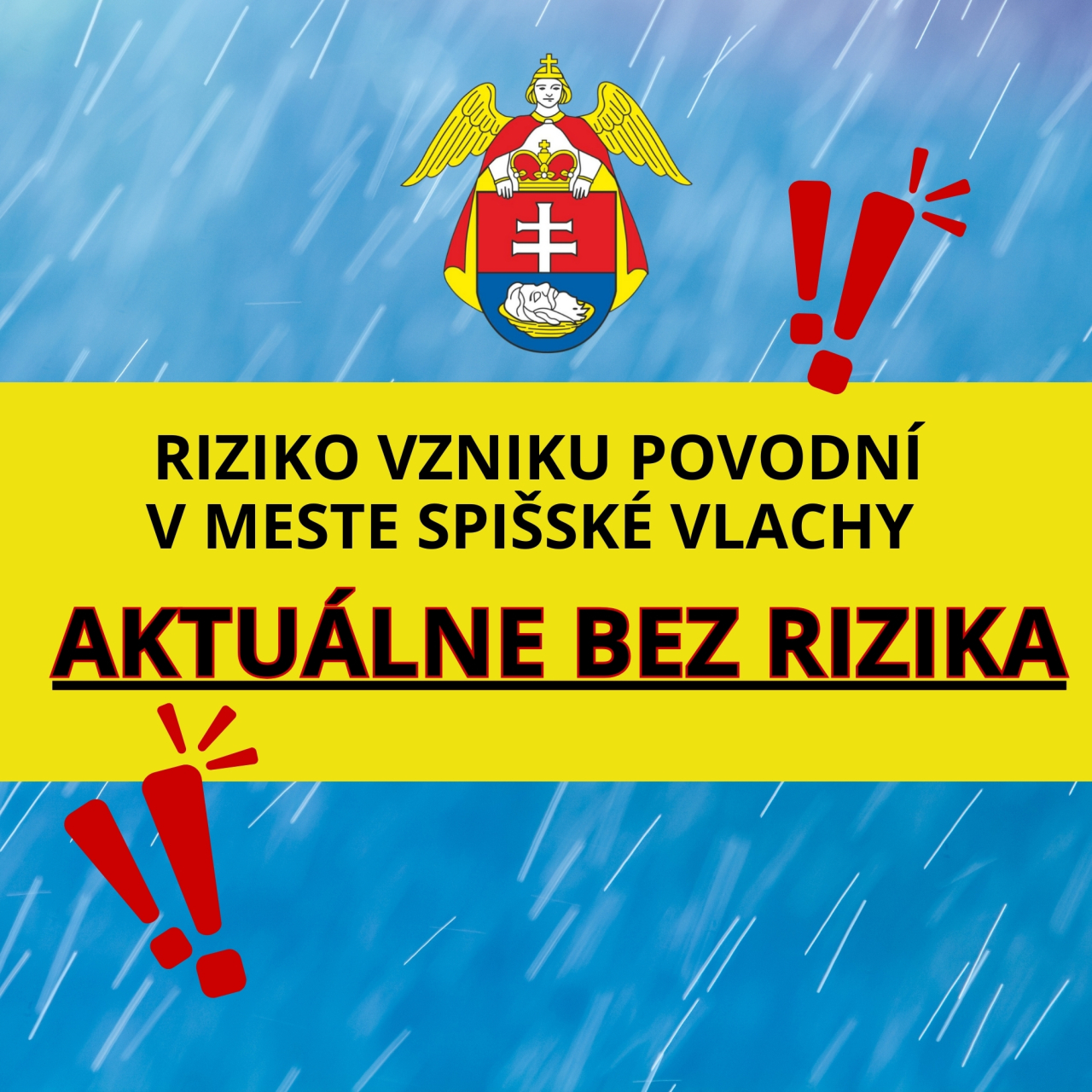 Stav vodných tokov v meste je kontrolovaný a je v norme. Situáciu aj napriek tomu konzultujeme s príslušnými orgánmi /Okresný úrad – Odbor krízového riadenia/, monitorujeme jej vývoj a predpoveď počasia a primátor mesta a krízový štáb je v pohotovosti.