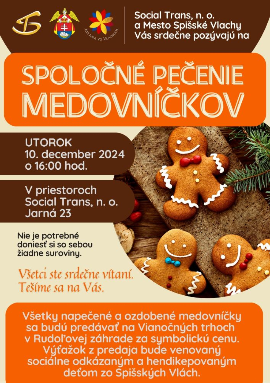 Vážení občania, spoločne so Social Trans, n. o. Vás srdečne pozývame na Spoločné pečenie a zdobenie vianočných medovníčkov. Stretneme sa v utorok, 10. decembra, o 16:00 hod. v priestoroch Social Trans na Jarnej č. 23. Nie je potrebné si so sebou priniesť žiadne suroviny. Určite neváhajte a príďte si užiť krásne chvíle v milej spoločnosti. Tešíme sa na spoločne strávený čas.