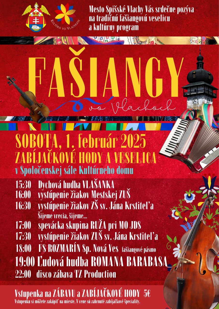 Máme tu zas fašiangový čas. Preto Vás srdečne pozývame na zabíjačkové hody a fašiangovú veselicu s kultúrnym programom - FAŠIANGY VO VLACHOCH, ktoré sa uskutočnia v sobotu, 1. februára 2025 v Spoločenskej sále Kultúrneho domu v Spišských Vlachoch. V kultúrnom programe sa predstavia žiaci ZŠ a ZUŠ sv. Jána Krstiteľa Spišské Vlachy, žiaci Mestskej ZUŠ Komenského 6 s folklórnym programom, Dychová hudba VLAŠANKA, Spevácka skupina Ruža pri MO JDS Sp. Vlachy. Taktiež privítame hostí: Folklórny súbor ROZMARÍN zo Spišskej Novej Vsi s fašiangovým pásmom a Ľudovú hudbu Romana Barabasa zo Spišskej Novej Vsi, ktorá Vás zaručene roztancuje. Veselicu zavŕši disko zábava v podaní TZ Production. Určite si tiež pochutnáte na tradičných fašiangových špecialitách.