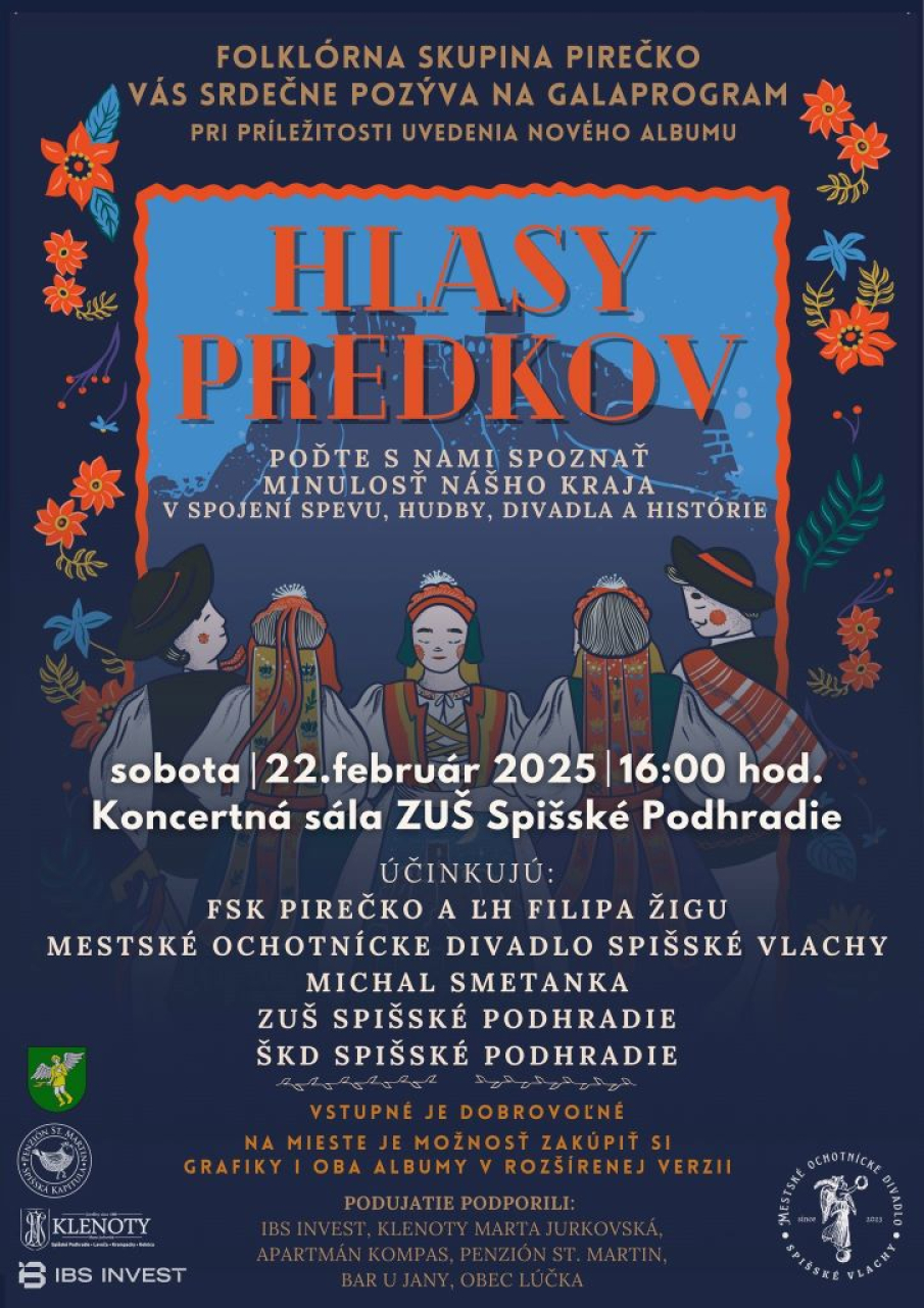 Mestské ochotnícke divadlo Spišské Vlachy sa predstaví v unikátnom galaprograme "HLASY PREDKOV", ktorého premiéra sa uskutoční v sobotu, 22. februára 2025, o 16:00 hod. v Koncertnej sále ZUŠ v Spišskom Podhradí. Vstupné je dobrovoľné. Spoločne s Fsk PIREČKO, ktorá uvedie pri tejto príležitosti do života svoj album, pre Vás pripravujeme skutočne výnimočný program v spojení spevu, hudby, divadla a histórie. Všetci ste srdečne vítaní.