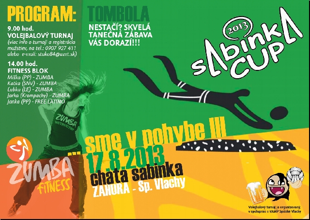 Pozývame Vás na tretí ročník športového dňa pod názvom Sabinka Cup 2013 ...sme v pohybe, ktorý sa uskutoční dňa 17.8.2013 na Chate Sabinka, na Zahure.
